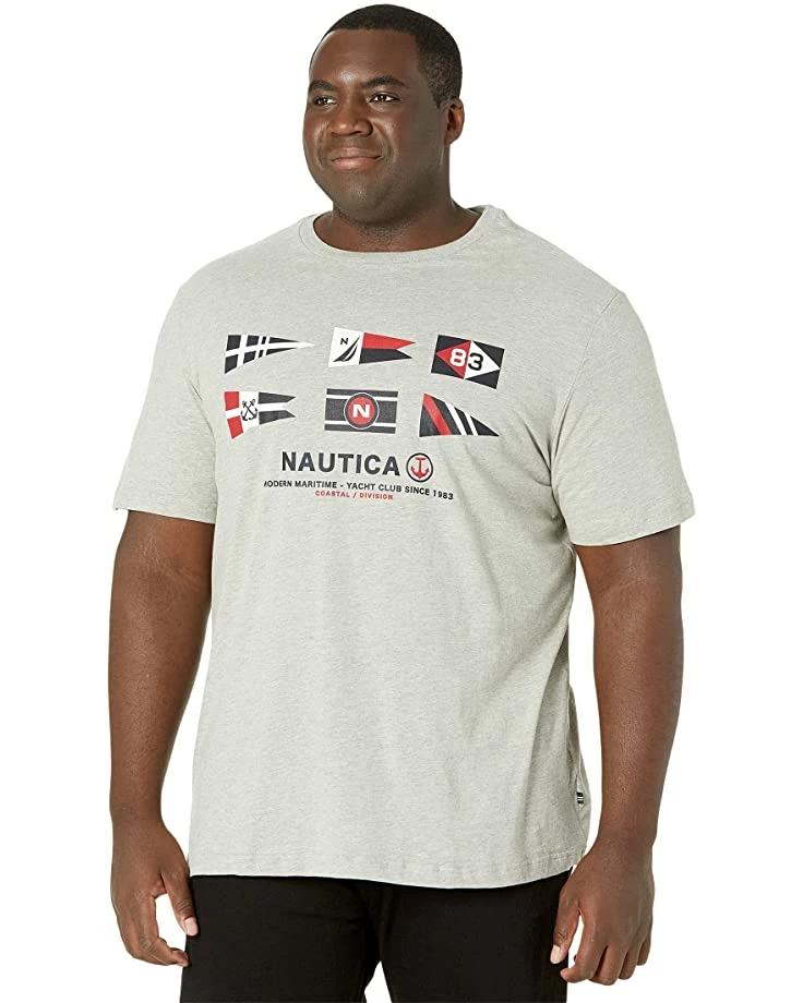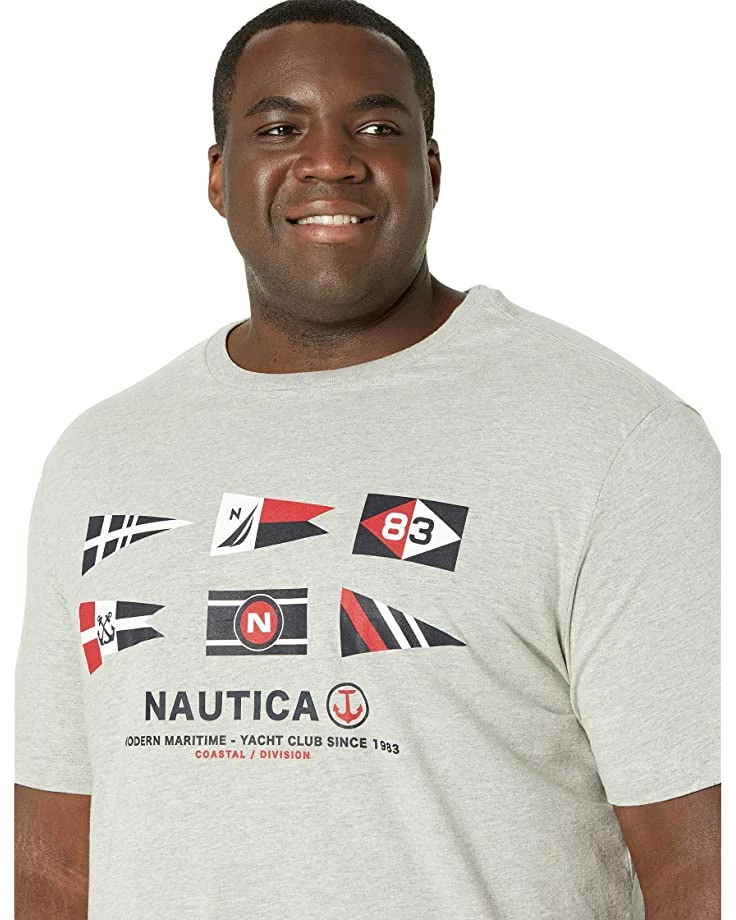 - Crafted for an all day style and comfort, the Nautica® Big & Tall Sustainably Crafted Graphic T-Shirt features a rounded neckline, short sleeves, center front flag inspired design, and a straight hemline.