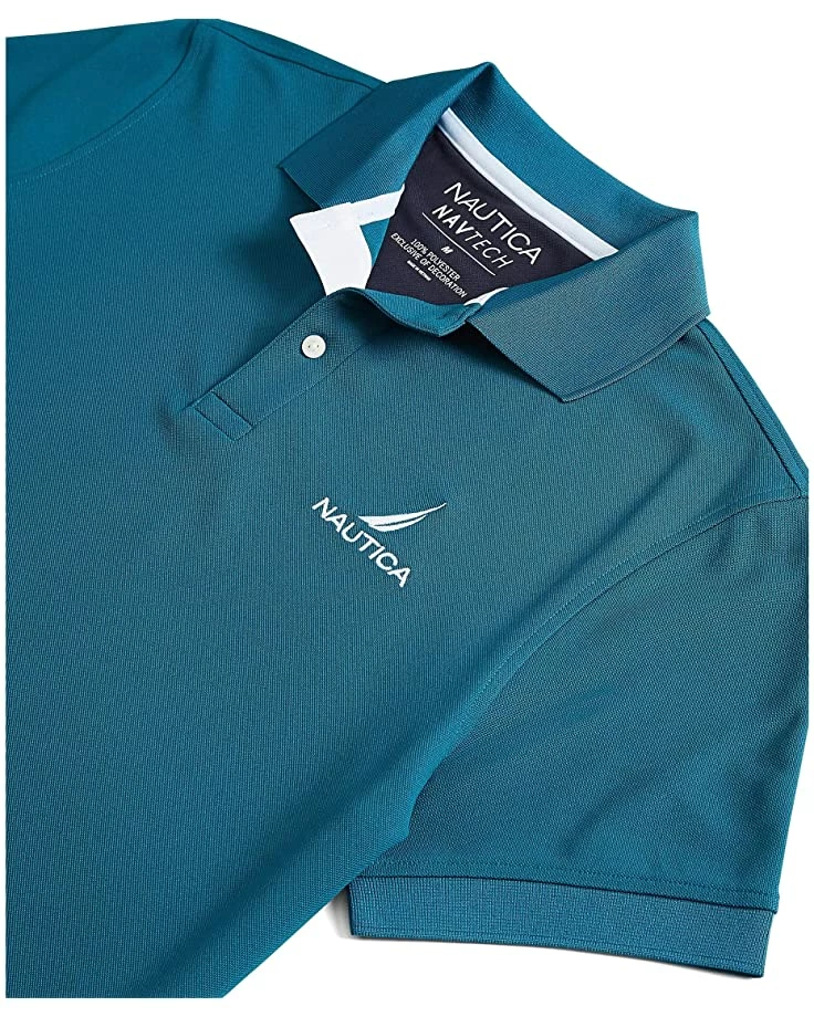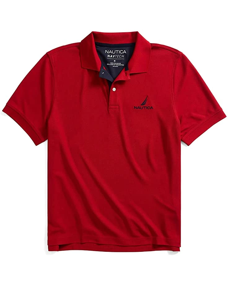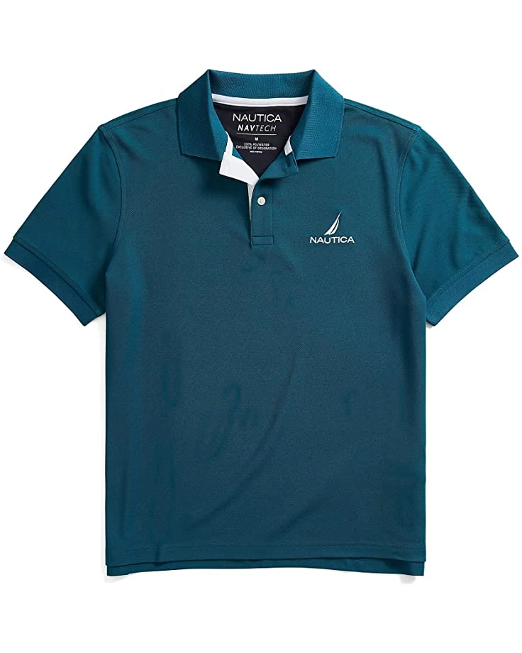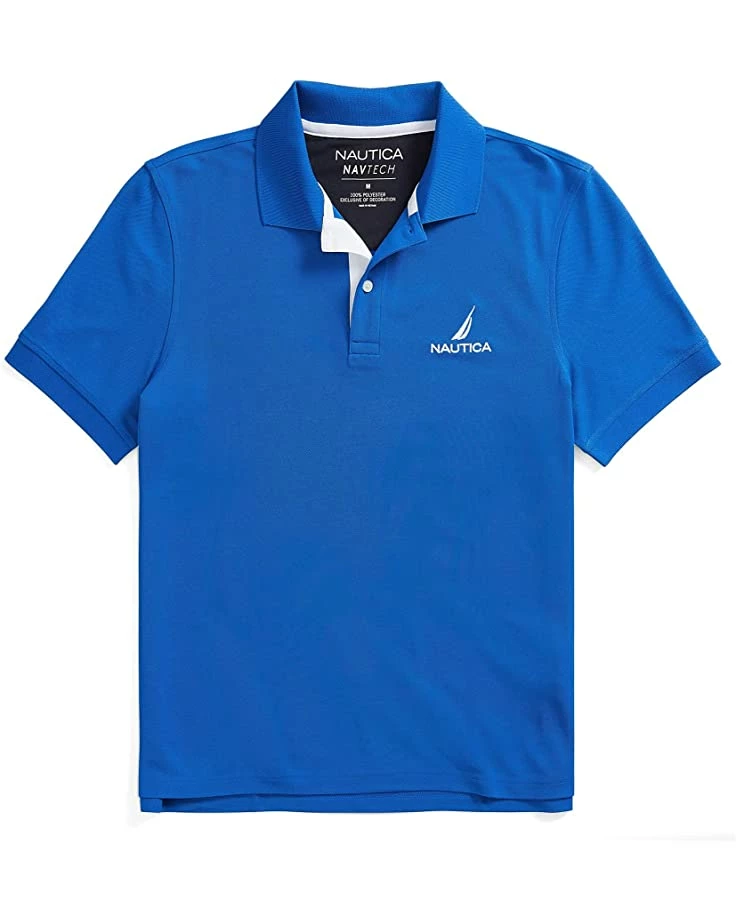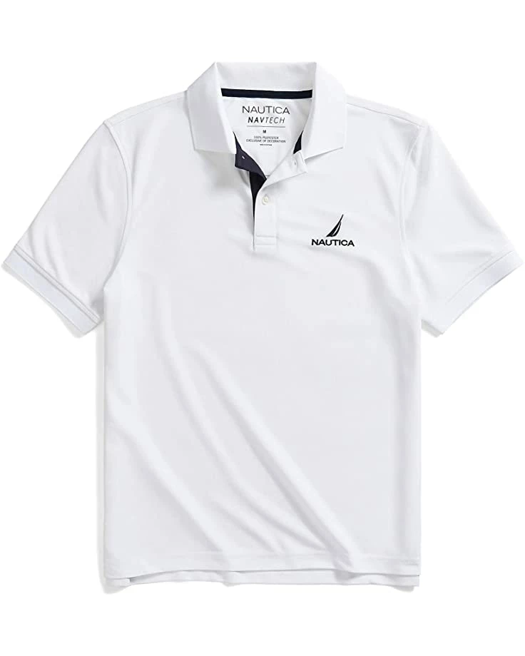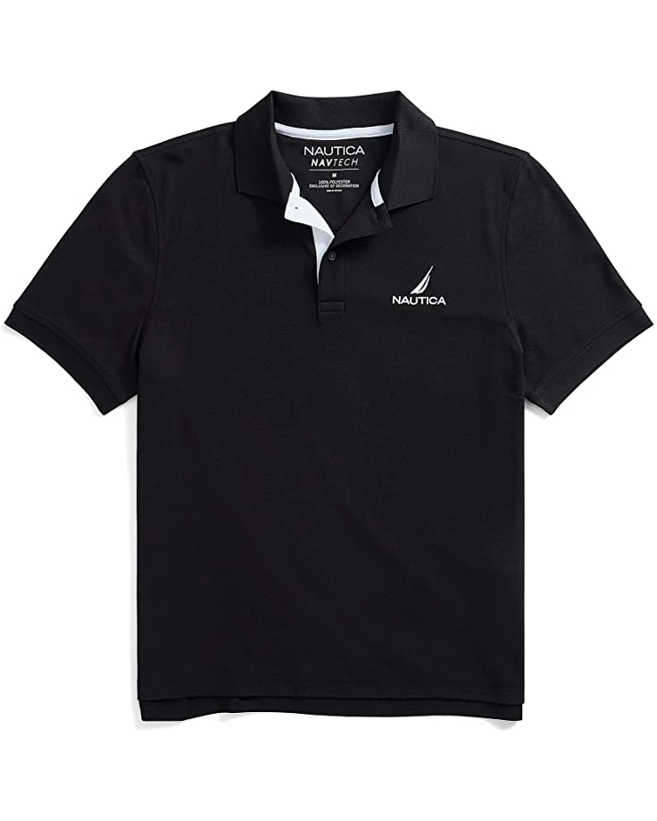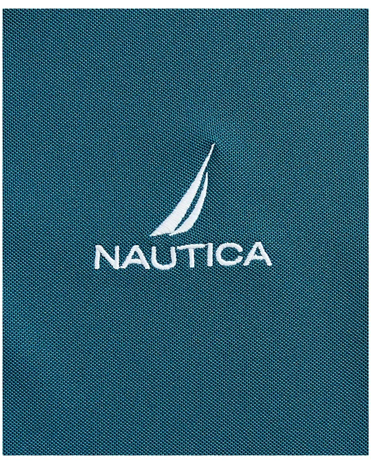 - Nautica and J-class logo at chest; stain releasing fabric properties; striped collar